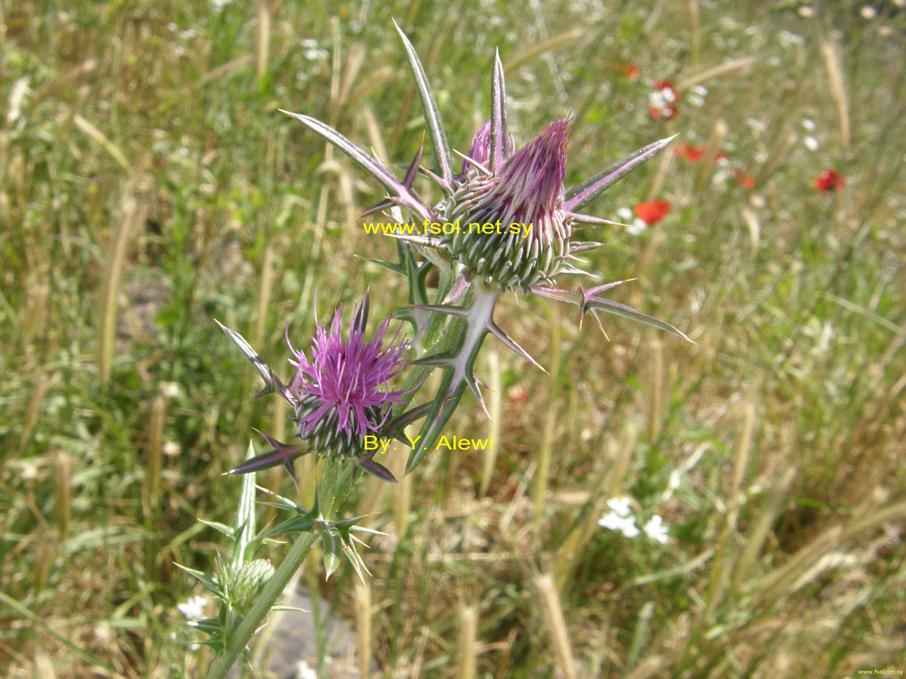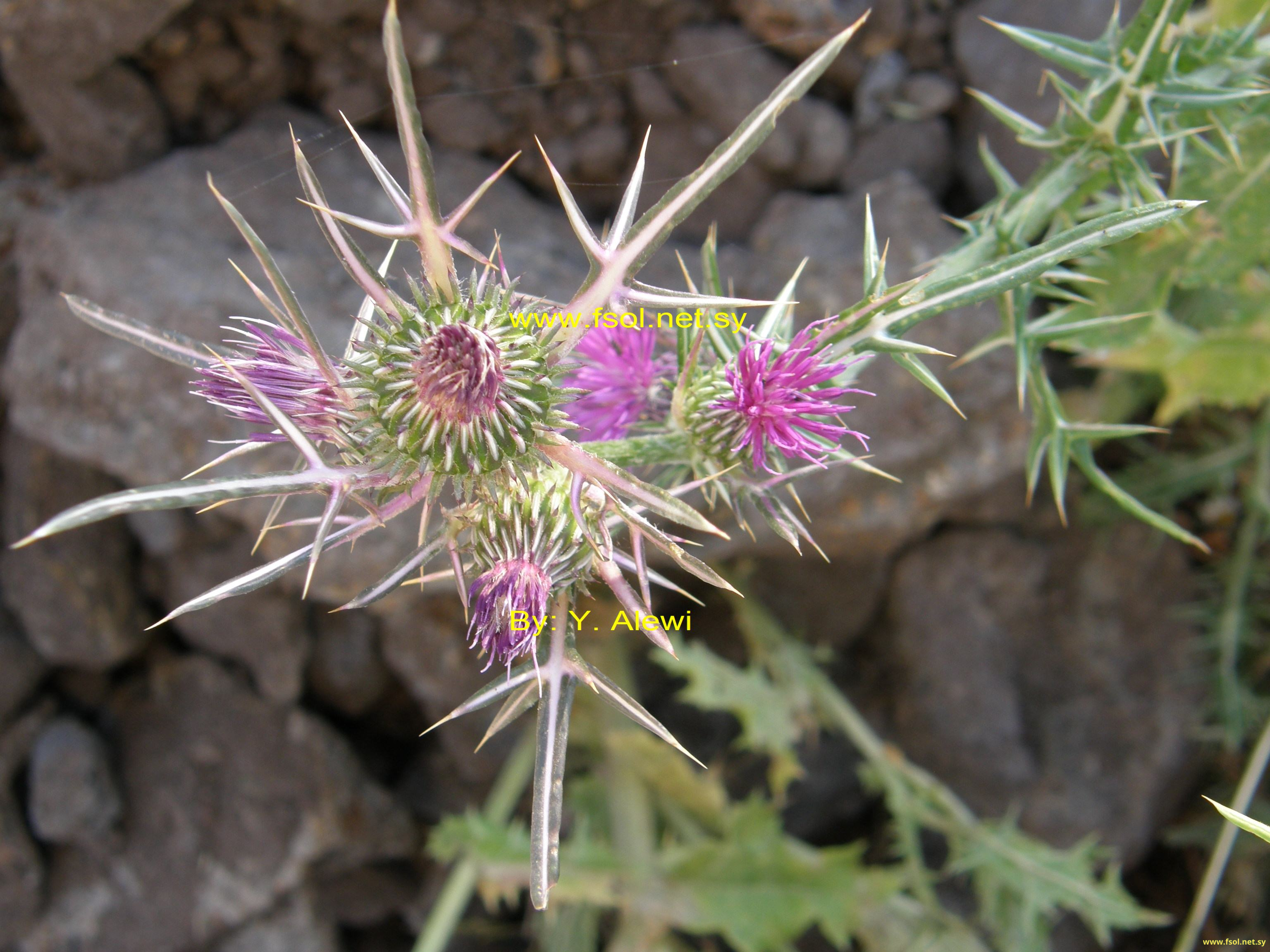 نبات عشبي قائم، حولي، مشوك، طوله 40 سم، ساقه عليها أخاديد، متفرعة من الأعلى. الأوراق بسيطة، كبيرة الحجم وخاصة السفلى منها، ذات عروق بيضاء، متطاولة- رمحية، مفصصة ريشية ذات حواف مسننة، الأوراق السفلى معنقة، والعلوية لاطئة، محتضنة للساق. الهامات قصيرة الشماريخ، قطرها 1- 3 سم، محاطة بقنابات طويلة تفوق الرؤوس، مفصصة ريشية مشوكة أرجوانية، طول3-5 سم.الأزهار انبوبية،أرجوانية.الثمار فقيرة سبسلاء، طولها5- 6 مم بنية اللون.