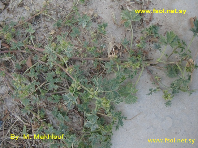نبات عشبي حولي، مفترش الأرض، طوله 10- 40 سم. الفروع الحديثة تحمل أوباراً والقديمة ملساء. الأذينات بيضاوية، حوالي 3 مم، تحمل أوباراً عند الحافة، الأوراق قرصية، قطرها 2- 5 سم، ذات 3- 5 فصوص عميقة، وكل فص ذو تسننات عميقة حادة غير متساوية، الأوراق السفلى طويلة الأعناق. الأزهار توجد في مجموعات إبطية. الكؤيس يتكون من 3 أجزاء شريطية، تحمل أوباراً ، طول الكأس 3 – 4 مم، الفصوص بيضاوية- مثلثية، مدببة، تحمل أوباراً عند الحافة. البتلات متطاولة، طولها 3 مم، بيضاء إلى زهرية فاتحة، القمة غائرة قليلاً. الثمار قطرها 5- 6 مم، بها 10 ثميرات قطرها أطول من 2 مم، سطحها شبكي، البذور كلوية بنية داكنة، سطحها خشن دقيق.