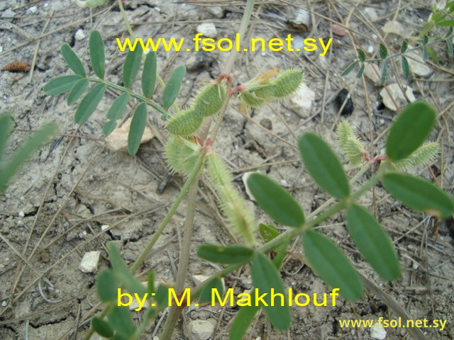 نبات عشبي حولي، متفرع من الأسفل، يحمل أوباراً قصيرة متجه للأعلى. الأذينات صغيرة مدببة، محمرة، الأوراق مركبة ريشية، طولها 5- 9 سم، الوريقات بيضاوية متطاولة، طولها 10- 13 مم، تحمل أوباراً من الأسفل. النورة رأسيمية، بها حوالي 5 أزهار. الشمراخ 8 سم. طول الزهرة 9 مم، القنابات محمرة، طولها 1.5 مم. القنييبات واحدة أسفل العنق وإثتنان أعلى العنق. الكأس 6 مم، يحمل أوباراً، الأسنان متساوية، أطول من الإنبوب. التويج غشائي، لونه كريمي، قمته وعروق زهرية. الثمار قرنية متخصرة بين البذور, منضغطة، عليها أشواك وأوبار كثيفة، البذور قرصية.