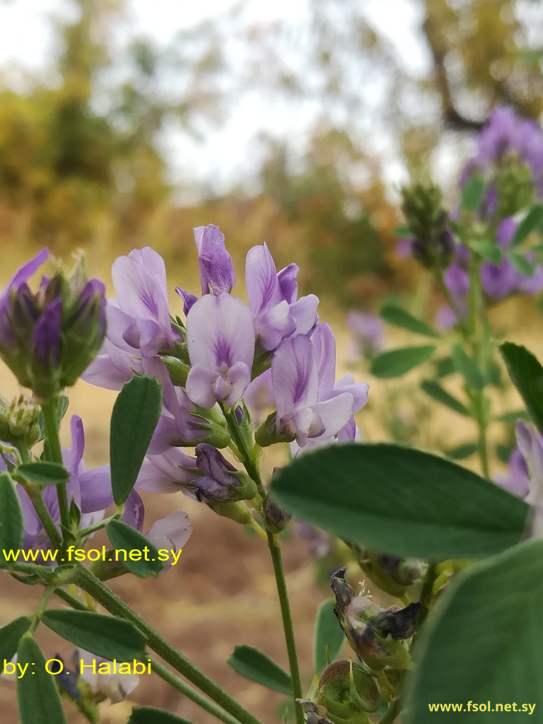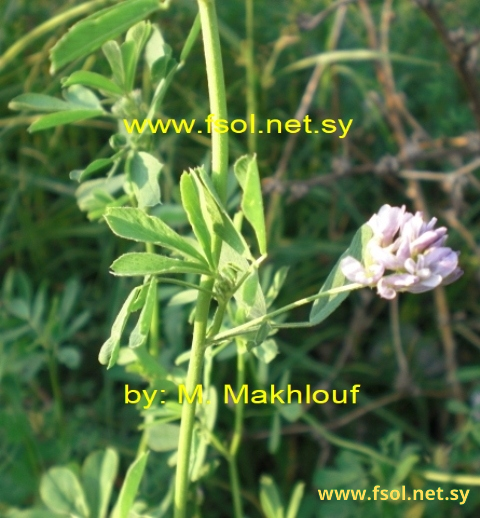 نبات عشبي معمر، قائم، طوله حوالي 40 سم، يحمل أوباراً متباعدة. الأوراق ثلاثية، ذات أذينات بيضاوية- رمحية، الوريقات طولها 1- 1,5 سم، بيضاوية مقلوبة إلى متطاولة- رمحية القمة مسننة. النورة رأسيمية، طولها 3- 5 سم، عديدة الأزهار. الأزهار زرقاء- أرجوانية طولها 6- 12 مم، الكأس يحمل أوباراً خفيفة. الثمار بقولية، ملتفة حلزونية إلى 2- 3 لفات تحمل أوباراً ، لا تحتوي على أشواك، عديدة البذور