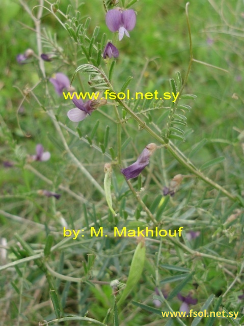 نبات عشبي حولي، يصل طوله الى 60 سم. ساقه مضلعة. الأذينات مجزأة الى فصين مثلثين طولها 2- 3 مم. الأوراق مركبة ريشية تنتهي بمحاليق متفرعة أو غير متفرعة يصل طولها إلى 5 سم، الوريقات 5- 6 أزواج، شريطية، طولها 10- 30 × 1- 2 مم، القمة مستوية بها زائدة وسطى قصيرة. الأزهار وحيدة، جابنية، الحامل الزهري 5 مم، أسنان الكأس غير متساوية الطول، السفلى أطول بالتدريج، يحمل أوباراً دقيقة. التويج بنفسجي، طوله 2 سم. الثمار منضغطة، شريطية، طولها 3- 4 سم، ذات منقار قصير منحني، البذور عديسية.