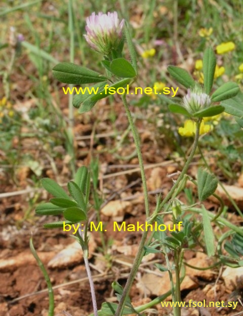 نبات عشبي حولي، 20 – 50 سم. ساقه قائمة أو مائلة، تحمل أوباراً . الأوراق متبادلة والعلوية متقابلة، الأذينات غشائية، متطاولة- شريطية،عليها أوبار كثيفة وعروق ملتحمة من الأسفل الوريقات1,2-2سم،السفلى بيضاوية مقلوبة،غائرة،العلوية إهليليجية ضيقة إلى متطاولة حوافها مسننة تحمل أوباراً.الرؤوس الزهرية1-2سم، بيضاوية، الزهرة1-1,3سم.الكأس إنبوبي- إسطواني إلى مخروطي مقلوب،10عروق، يحمل أوباراً كثيفة من الأعلى الأسنان غير متساوية، قممها بنفسجية، السن السفلى أطول من الأنبوب وبقية الأسنان. التويجى حليبي أو زهري، العلم متطاول،1- 1,5سم،أطول من الجناحين والزورق. الرؤوس الثمرية1,2- 2,5سم، كروية- بيضاوية، مشوكة، الكؤوس الثمرية ذات حلق مغلق وأسنان مشوكة تحمل أوباراً طويلة،القرون بيضاوية،غشائية، البذور وحيدة،1,3مم، بيضاوية، بنية مصفرة.